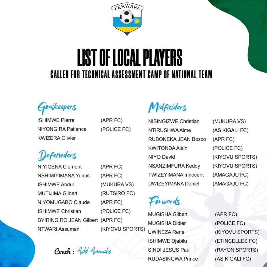 Umutoza w'ikipe y'igihugu y'u Rwanda 'Amavubi', Adel Amrouche yahamagaye abakinnyi 25 bazifashishwa mu mwiherero usa no kongera kureba urwego rw'abakinnyi ni uko bazifashishwa mu bihe biri imbere.