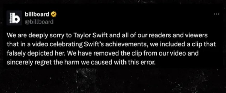 Ku mugoroba wo ku wa 26 Ugushyingo 2024 urubuga rwa Billboard rwatangaje ko Taylor Swift ari we muhanzikazi wa kabiri w'ikinyejana cya 21, mu kwishimira ibyo yagezeho, urwo rubuga rwasakaje ku mbuga nkoranyambaga zarwo amashusho arimo agace kagaragaza umuntu usa na Taylor Swift (si we, ahubwo ni ishusho isa na we) yiyambuye ubusa. Bamaze kubona ko bakoze amakosa basabye imbabazi.
