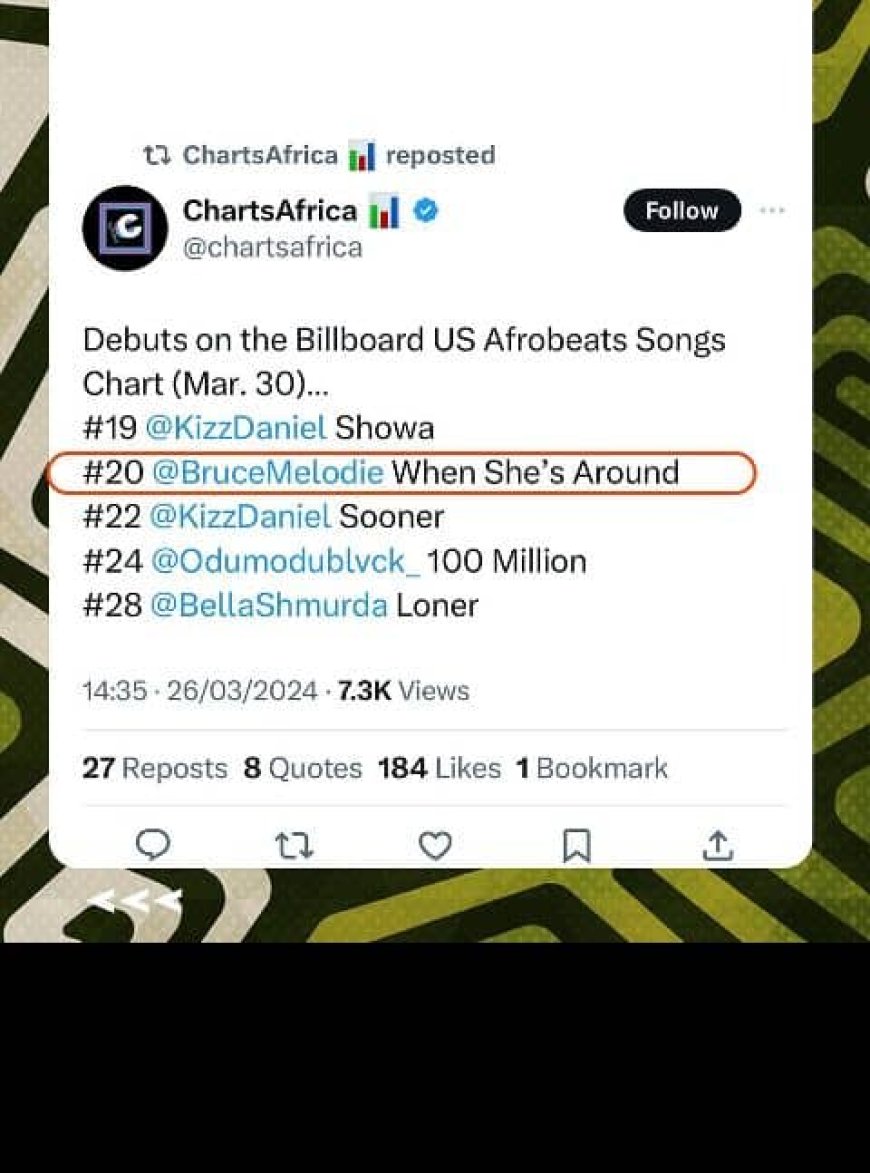 Umuhanzi Itahiwacu Bruce wamamaye nka Bruce Melody yongeye gushimangira ko ari umuhanzi ukomeye hano mu Rwanda yandika amateka atarigeze akorwa n’undi wese hano mu Rwanda yo kugira indirimbo iri ku rutonde mpuzamahanga rwa Billibord.