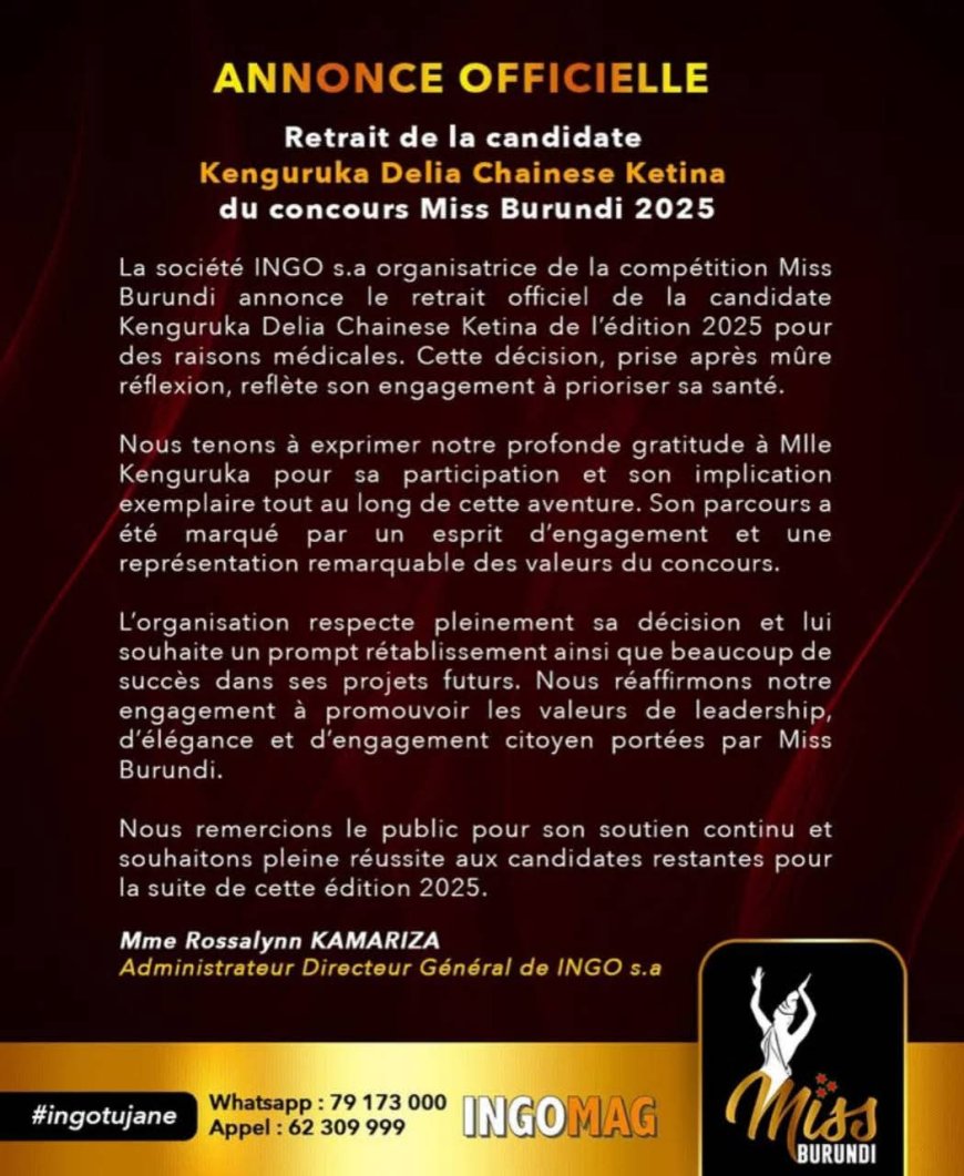 Ni iryo tangazo rihamya ko Miss Kenguruka atakiri mu bahataniye ikamba rya Miss Burundi 2025 kubera uburwayi