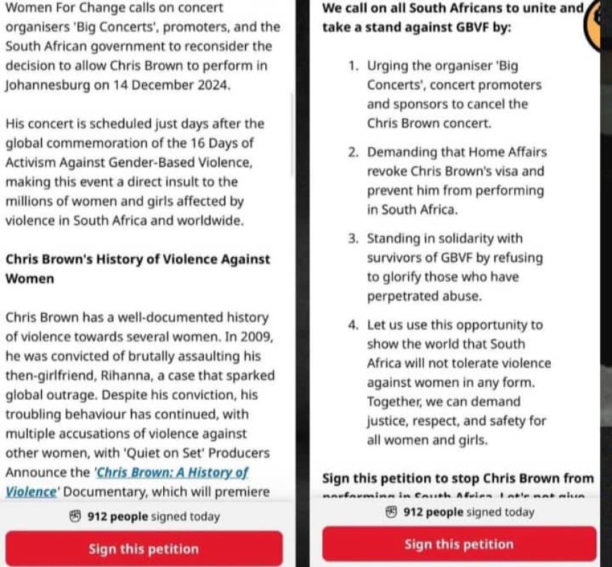Itsinda ry’abagore riharanira uburenganzira bw’igitsinagore [Woman Change] ryo muri Afurika y’Epfo ryiyemeje guhagarika icyo gitaramo cya Chris Brown kubera amateka ye mabi yagize yo gukubita uwari umukunzi we, Rihanna.