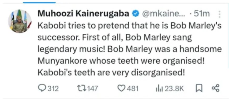 Yagize ati:"Kabobi agerageza kwijijisha abeshya ko ari umusimbura wa Bob Marley. Mbere na mbere, Bob Marley yaririmbye indirimbo zitazibagirana! Bob Marley yari umugabo mwiza ufite amenyo ari ku murongo. Ariko amenyo ya Kabobi ntari ku murongo."