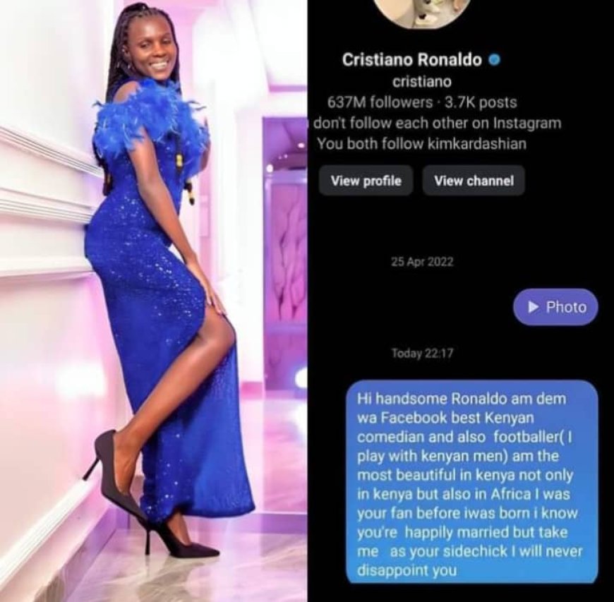 Kuri uyu wa 02 Nzeri 2024 yahisemo noneho kumwandikira ubutumwa bwuzuyemo imitoma. Yagize ati:”Muraho mugabo mwiza Ronaldo! Nitwa Dem wa Facebook, nkaba ndi umunyarwenyakazi n’umukinnyikazi mwiza w’umupira w’amaguru ( nkinana n’abagabo bo muri Kenya).”