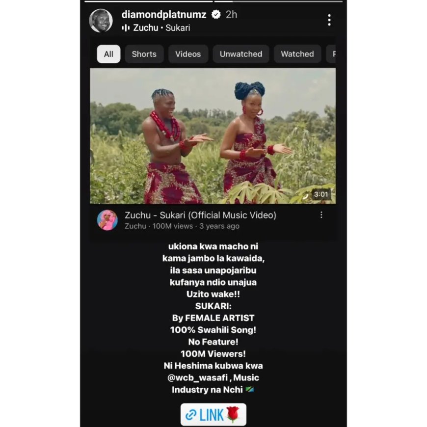 Mu butumwa yanyujiye kuri Instagram ye (Story) Diamond yavuze ko ibi ari ibintu birenze cyane nubwo umuntu utabikora atapfa kumva uburemere bwabyo, avuga ko kandi iri ari ishema kuri Wasafi records ndetse n’igihugu muri rusange. Yagize ati “Iyo ubirebesheje amaso yawe bisa nk’aho ari ibintu bisanzwe ariko iyo ugerageje kubikora nibwo umenya uburemere bwabyo. Miliyoni 100 z’abamaze kureba indirimbo Sukari ni icyubahiro kuri Wasafi, uruganda rw’umuziki ndetse n’igihugu muri rusange.”