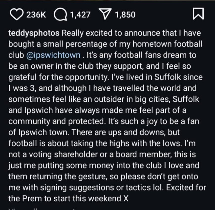Yagize ati:”Nishimiye kumenyesha ko namaze kugura umugabane muto mu ikipe yo mu mujyi wanjye ‘Ipswich Town.’ Ni inzozi z’abafana b’ikipe y’umupira w’amaguru kugira umugabane mu ikipe bafana; bituma uza muri banyirayo, ndumva amashimwe andusha imbaraga ku bw’aya mahirwe.”