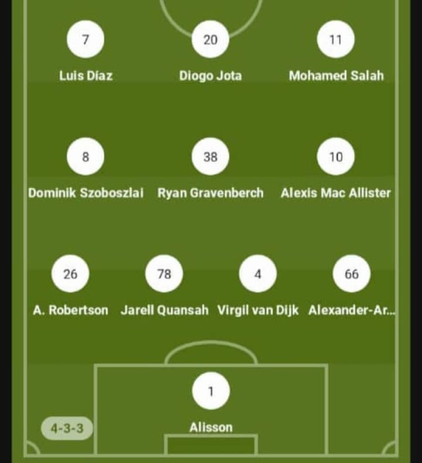 Ikipe ya Liverpool yatangiranye umuzamu, Alisson, imbere ye; Robertson, Jarell Quansah, Virjil Van Dijk na Alexander Arnold, mu kibuga hagati hari Dominik Szoboszlal, Ryan Gravenberch na Alexis Mac Allister, batakisha; Luis Diaz, Diogo Jota na Mohamed Salah.