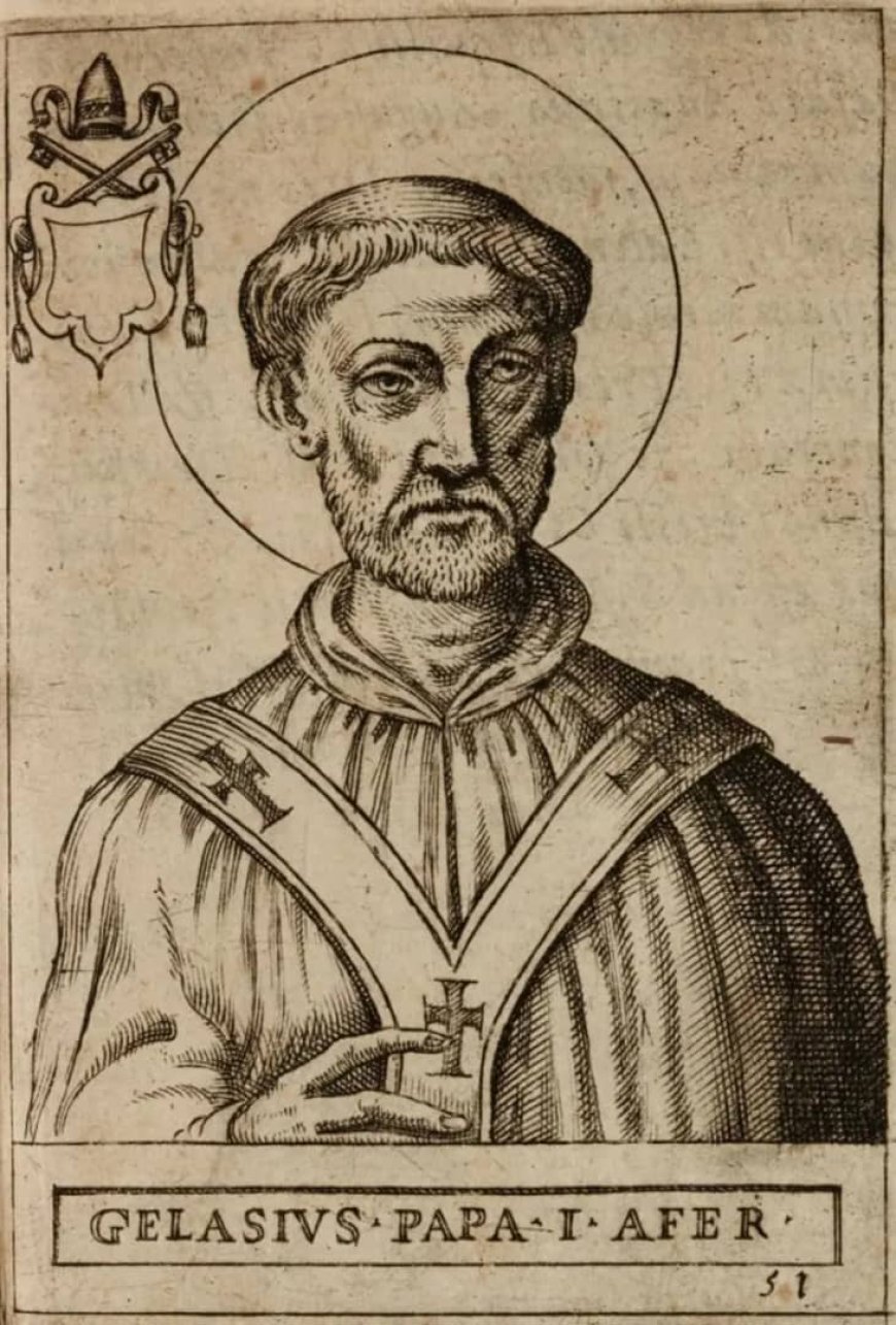 Papa Gelasius I yavuze ko ubutegetsi bwa Kiliziya bufite isoko ku Mana, na yo igatanga ubuyobozi kuri Leta, ibyakumvwa nk'aho Kiliziya Gatolika iri hejuru ya Leta.
