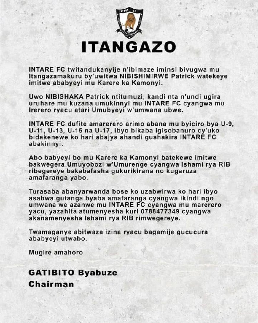 Bagize bati "Intare FC twitandukanyije n'ibimaze iminsi bivugwa mu Itangazamakuru by'uwitwa NIBISHIMIRWE Patrick watekeye imitwe ababyeyi mu Karere ka Kamonyi.