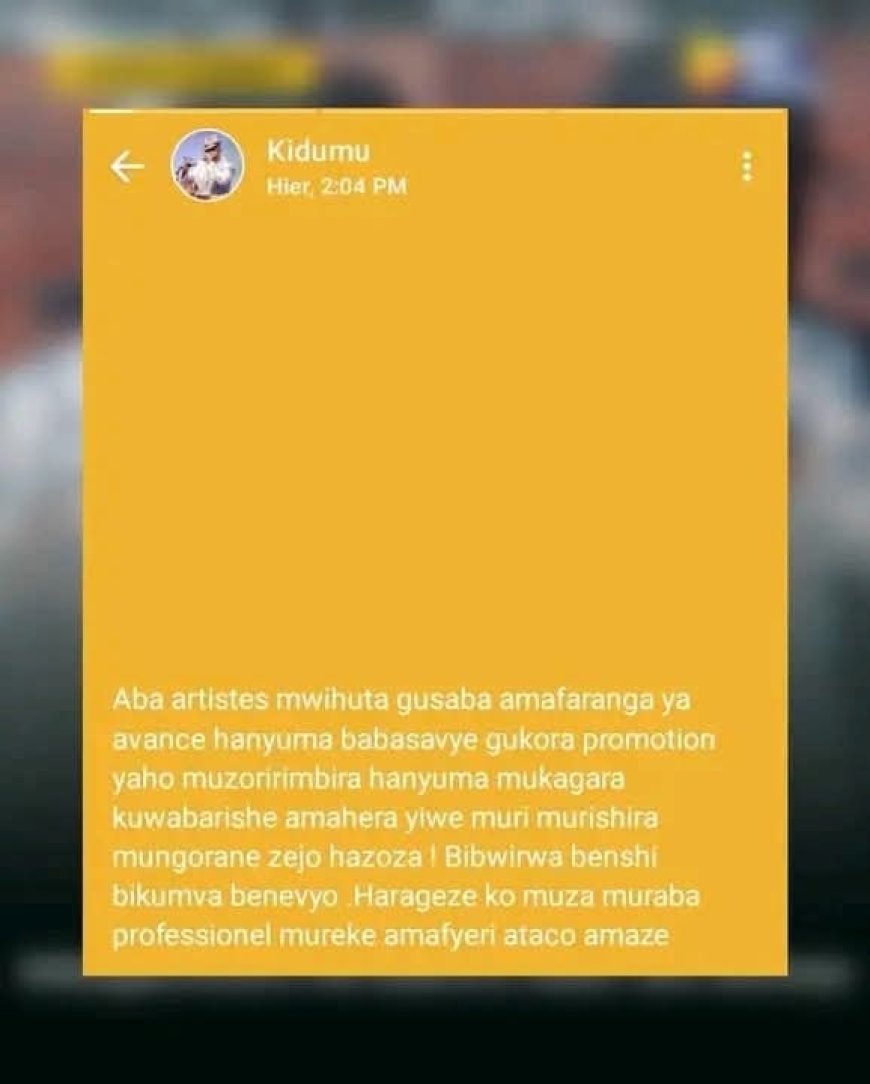 Mu butumwa yacishije ku rubuga rwa WhatsApp yagize ati:"Abahanzi mwihutira gusaba amafaranga ya 'avance' hanyuma babasaba kwamamaza icyo gitaramo muzaririmbamo mukiyemera k'uwabishyuye amafaranga ye, murimo murishyira mu ngorane z'ejo hazaza. Habwirwa benshi hakumva bene yo."