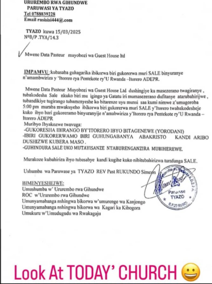 Iyo baruwa ifite umwirondoro ugaragaza ko ari iyo muri ADEPR Ururembo rwa Gihundwe, Paruwasi ya Ntyazo. Ikaba yari yandikiwe Umupasiteri akaba umuyobozi wa Guest House Ltd irimo sale yari yakodeshejwe na Moise Turahirwa.