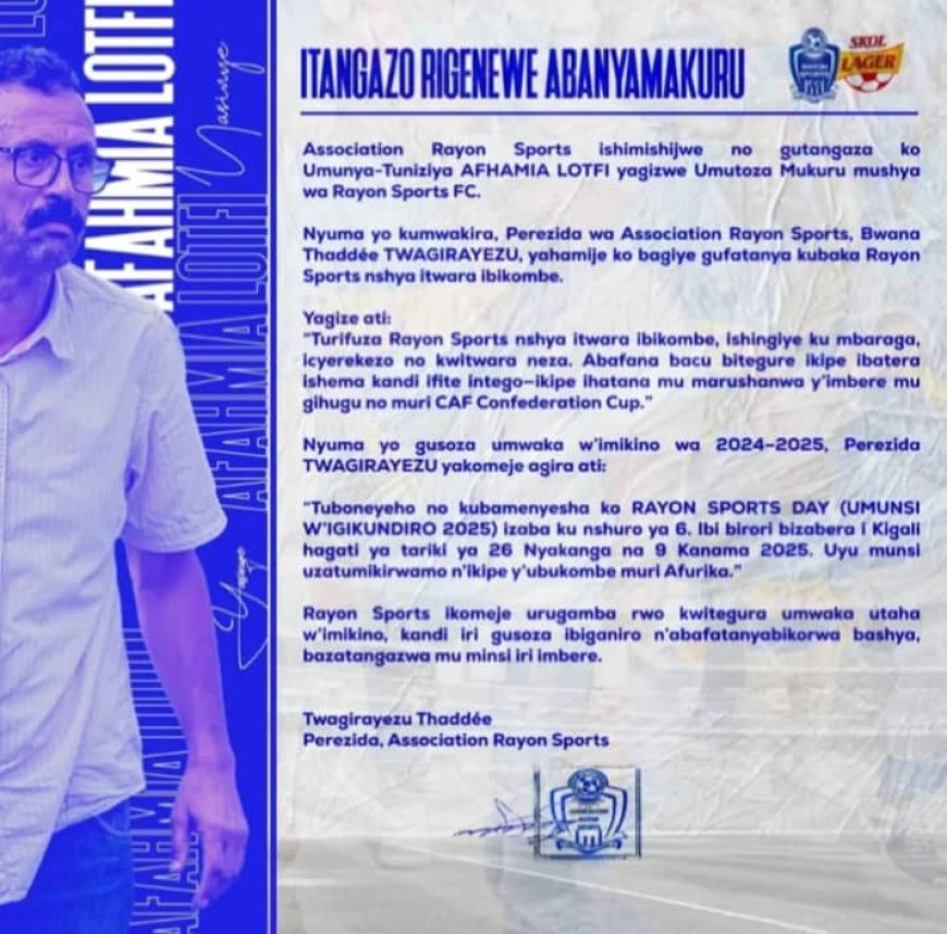 Iryo tangazo ryashyizwe ritangira rivuga ko Rayon Sports inejejwe no kumenyesha ko Umunya-Tunisia, Afhamia Lofti yagizwe umutoza mukuru wa Rayon Sports.
