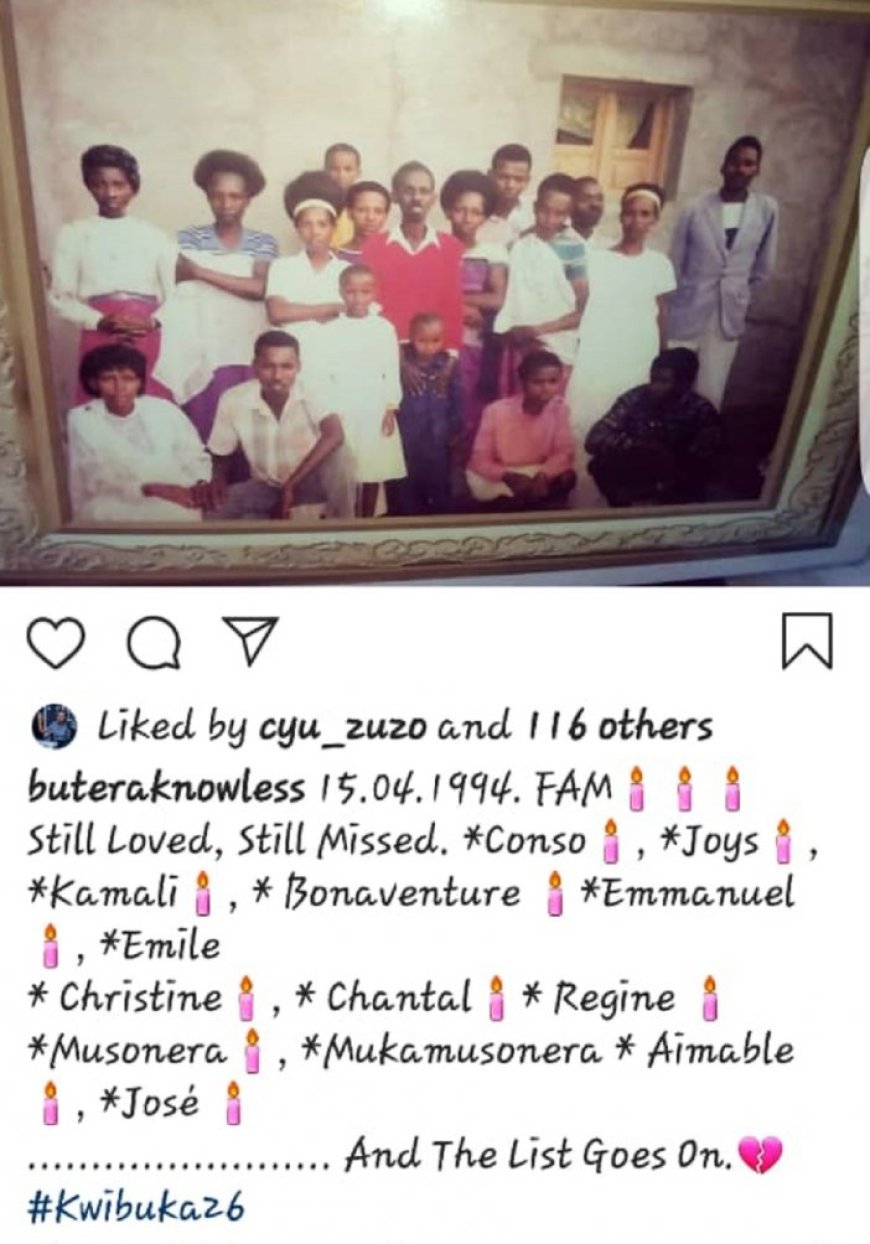 Kwibuka ku nshuro ya 26 Jenoside yakorewe Abatutsi mu mwaka wa 1994, Butera Knowless yagaragaje amazina ya bamwe mu muryango we bishwe muri Jenoside yakorewe Abatutsi