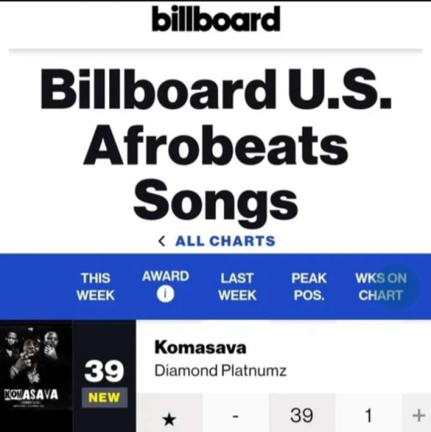 Ku mugoroba wo ku wa Kabiri, tariki ya 06 Kanama, nibwo inkuru nziza yatashye muri Leta Zunze Ubumwe za Tanzania ivuga ko indirimbo 'Komasava' Diamond Platnumz yahuriyemo n'abahanzi bo muri Afurika y'Epfo; Khalil na Chley, nyuma bayisubiranamo na Jason Derulo, yamaze kugera ku rubuga rwa Billboard ruzwi nka 'Billboard U.S Afrobeats Songs,' yinjirira ku mwanya wa 39.