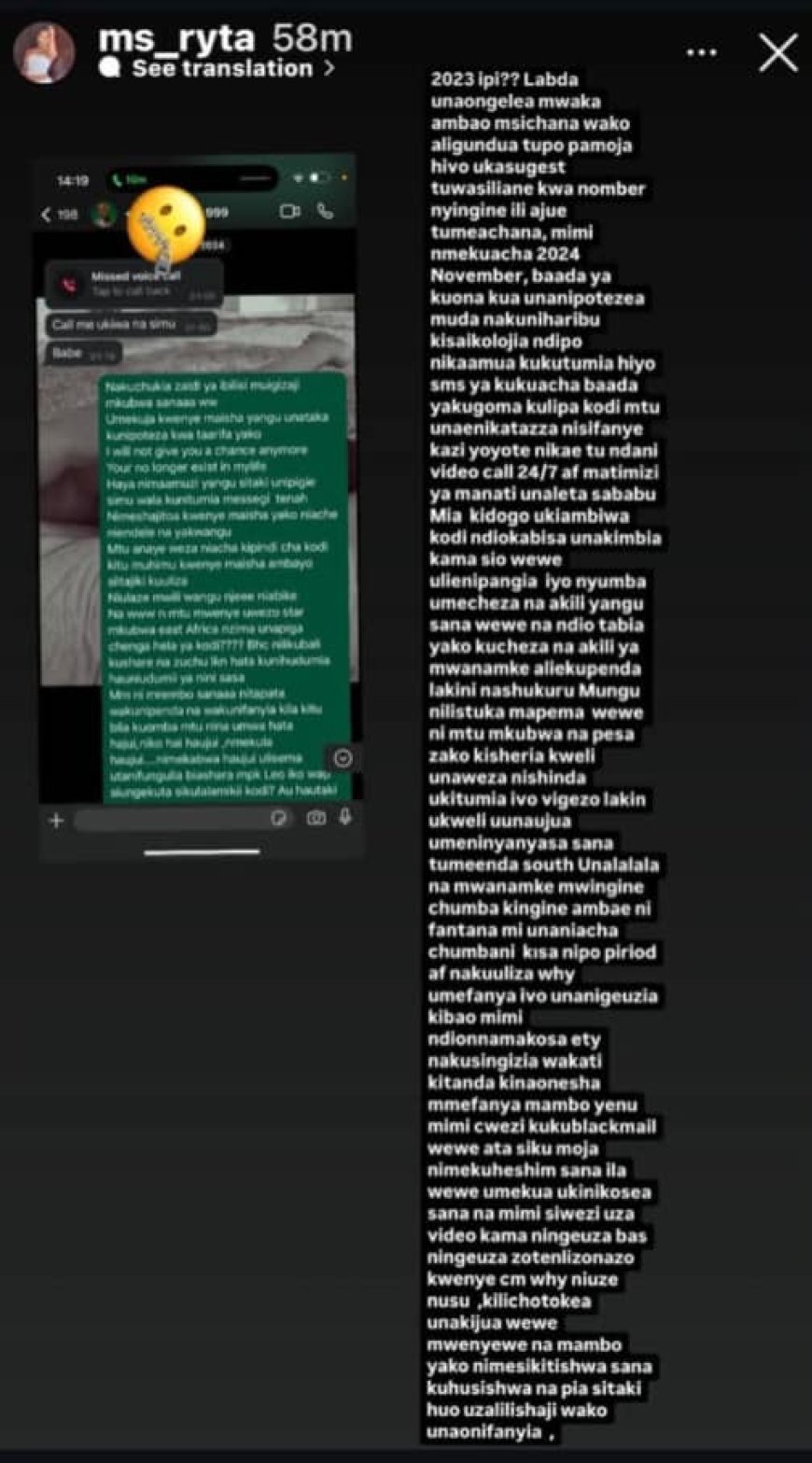 “Sinshora kugukangisha amashusho ngo ndagushakaho amafaranga. Ariko wagiye unkorera amakosa atandukanye. Twajyanye muri Afurika y’Epfo urarana n’undi mukobwa witwa Fantana mu kindi cyumba kandi wari unsize mu cyumba ndi mu kwezi. Nyuma narakubajije nti: ni ukubera iki unkoreye ibintu nk’ibyo?”