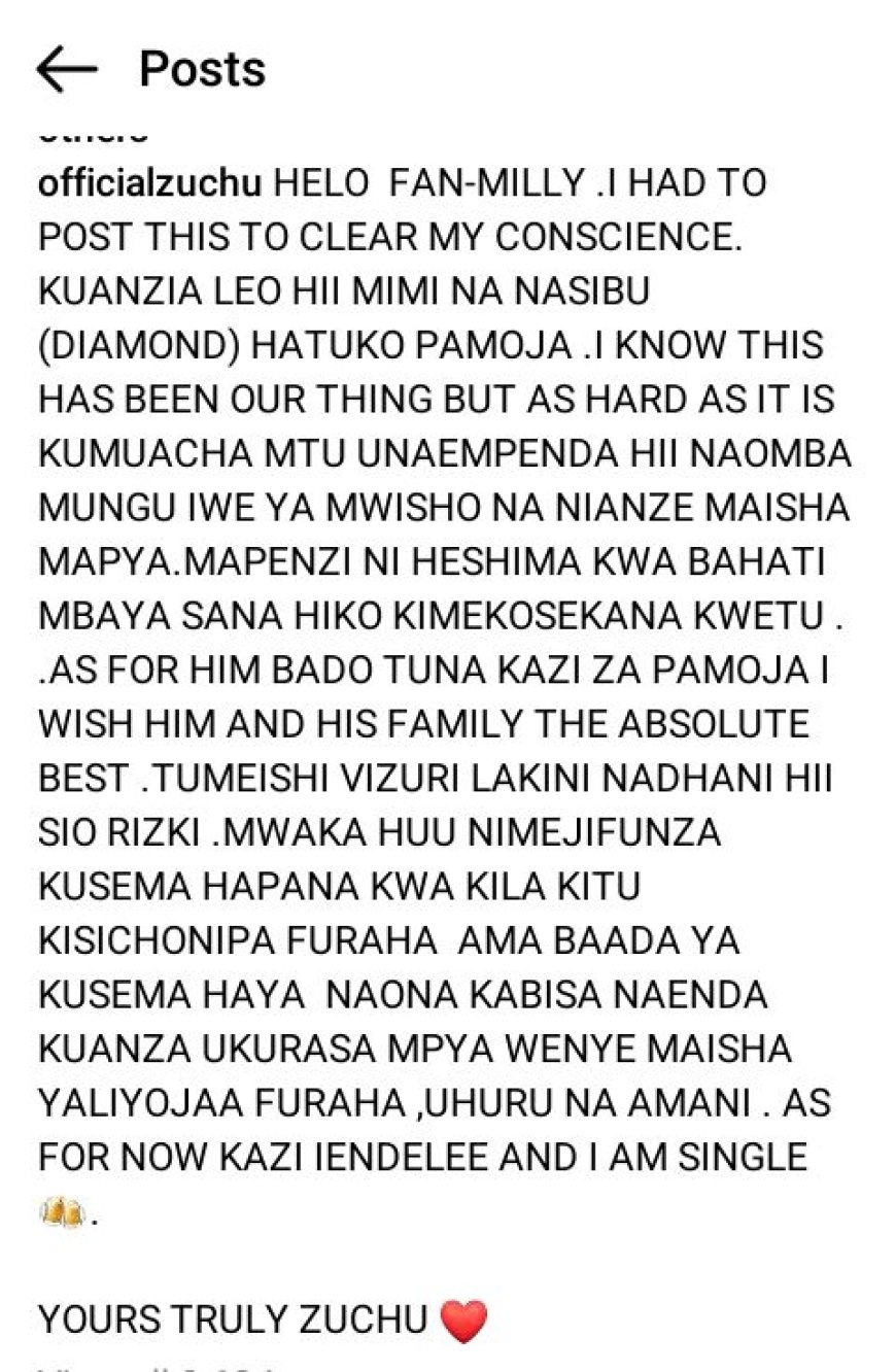 Zuchu mu butumwa burebure yanyujije ku rukuta rwe rwa Instagram yatangaje ko guhera uyu munsi atakiri kumwe na Diamond ko agiye gutangira ubuzima bwe bushya bwuzuye umunezero, amahoro ndetse n'ubwisanzure.